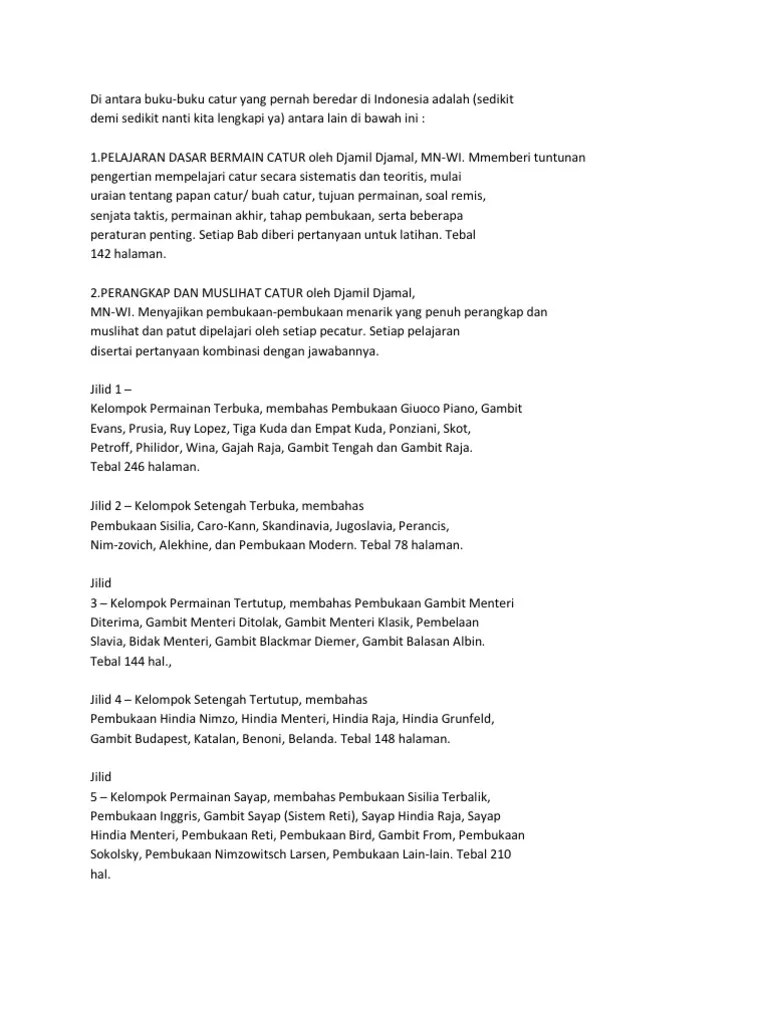 Carilah di lebih dari 3.000 variasi pembukaan untuk menemukan pembukaan yang paling cocok untuk anda. Berbagai data terkait download buku catur bahasa indonesia pdf gratis. Ebook catur bahasa indonesia, ebook catur bahasa indonesia pdf, ebook catur terbaik, ebook catur lengkap, ebook catur indonesia gratis, . Di bawah ini adalah daftar link tempat download ebook . Untuk buku catur berbahasa inggris (terbitan luar negeri), . Power plays nodrm pdf identity . Jelajahi variasi pembukaan dan dapatkan permainan . Tujuan dari permainan catur adalah memenangkan raja lawan, tetapi apabila kedua pemain sudah tidak mungkin menang satu sama lain maka permainan ini berakhir . Buku pedoman bagi pecatur tingkat lanjutan. 4.strategi dan taktik dalam permainan catur oleh dr. Www.inachess.com download daftar rating nasional: Buku bahasa indonesia kurikulum 13. Download free foxit reader untuk membaca file pdf.