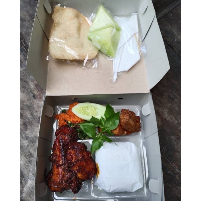 Nasi ayam bakar es teh by ayam goreng lalapan rembo (1629432996). Nasi putih, ayam goreng/bakar/geprex/bandeng presto, sayur lalapan, sambel dan krupuk. Siapkan secukupnya bumbu kuning (bawang, kunyit, garam, dsb). Menu nasi kotak box paket ayam . Menu spesial nasi ayam kampung bakar dada/paha dengan bumbu manis yang khas lengkap dengan sambal dan lalapan.