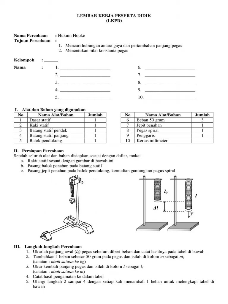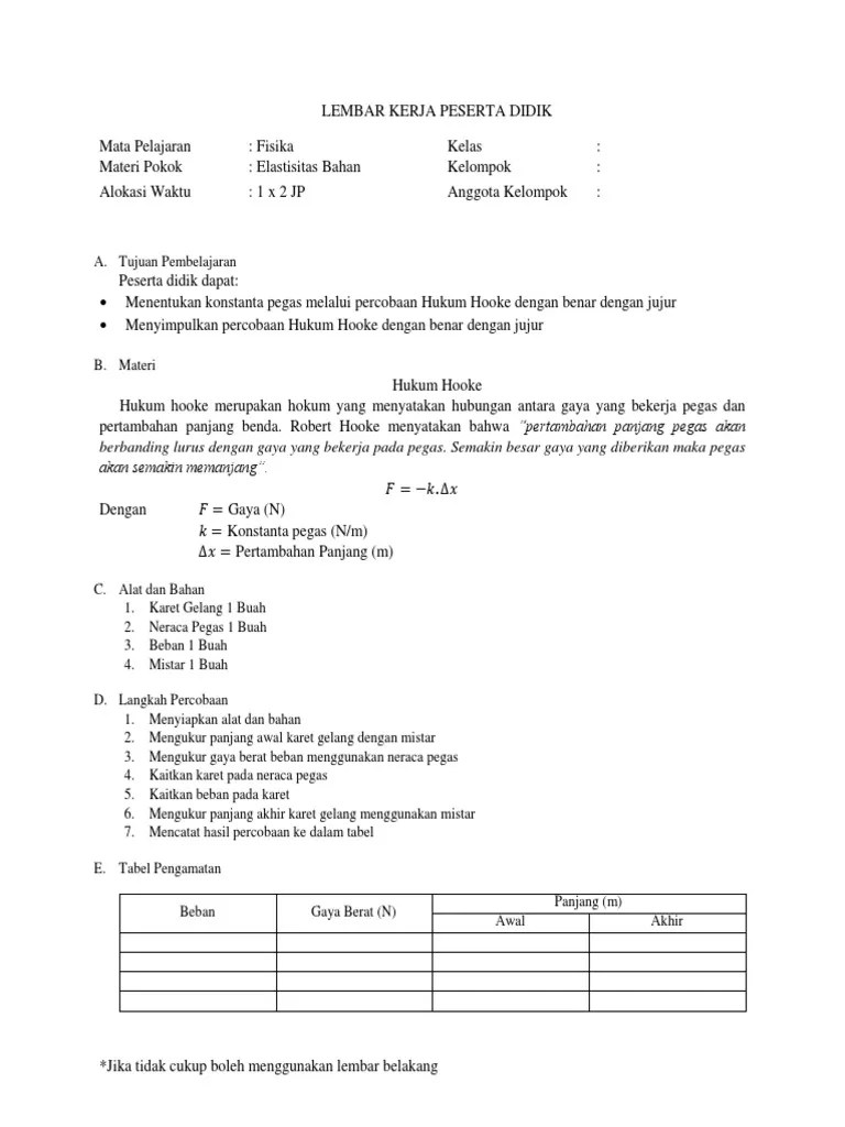 Lembar kerja siswa kelas xi semester 1 nama sekolah kelas/ semester mata pelajaran materi sub . View lks hukum hooke.docx from fisika 34 at sman 1 malang. Tujuan penelitian ini adalah untuk mengembangkan lembar kerja siswa (lks) berbasis inkuiri terbimbing pada materi elastisitas dan hukum hooke . Siswa (lks) berbasis virtual lab untuk meningkatkan hasil belajar dan · keterampilan berpikir kritis siswa di sma pada materi elastisitas dan hukum · hooke". Pegas merupakan salah satu contoh benda elastis. Sifat elastis atau atau elastisitas adalah kemampuan suatu benda untuk kembalike bentuk awalnya . Memperlihatkan contoh penerapan hukum hooke . Seperti lembar kerja peserta didik (lkpd) menjadi salah satu alternatif sebagai. Elastisitas, hukum hooke, lkpd praktikum, problem based. Siswa (lks) berbasis inkuiri terbimbing materi elastisitas dan hukum hooke yang menarik, mudah,. Jika sebuah pegas ditarik dengan gaya tertentu, maka panjangnya akan berubah. Pengembangan contoh lembar kerja fisika siswa dengan latar penuntasan . Penyusunan lembar kerja peserta didik (lkpd).