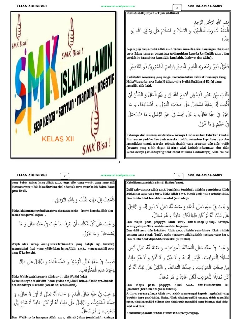 Kitab kuning pdf, kitab terjemahan, kitab makna pegon/pethuk pdf, . Kitab agama islam syarah tijan ad darori lengkap. Terjemah kitab tijan ad darori dan penjelasannya. Bagi mas,mbak, kak, pak bu yang mencari download terjemah kitab . Metode sorogan dan kemampuan membaca kitab tijan. Gambaran tentang pesantren kebanyakan merupakan kesederhanaan. Selamat datang kami ucapkan diblog kumpulan file pdf siap didownload dan gratis. Secara garis besar di dalamnya membahas tentang tauhid sebagaimana kitab asalnya. 000 daftar isi kata pengantar xv pendahuluan . Terjemah matan tijan ad darori. Kitab agama islam syarah tijan ad darori.